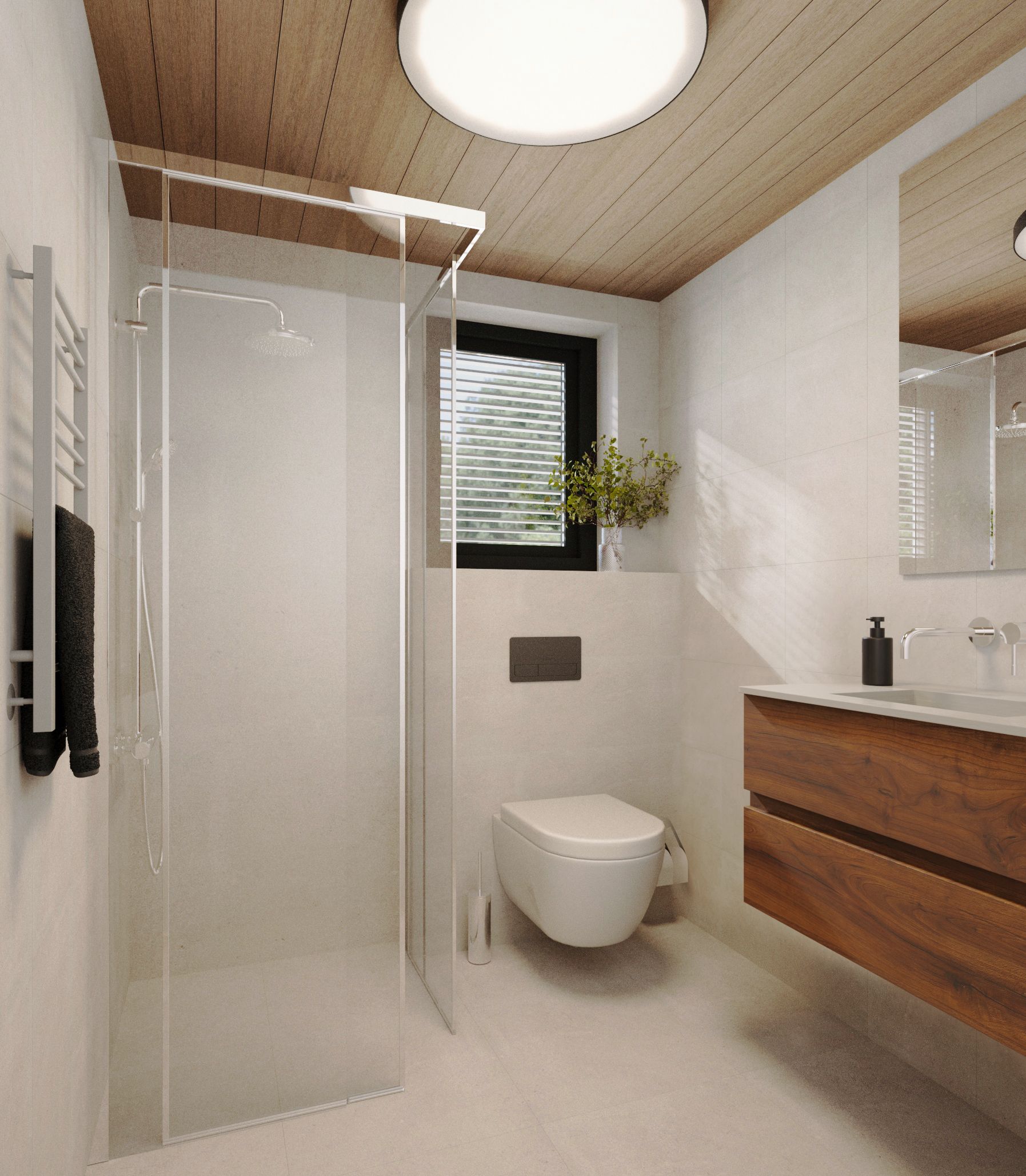 Badet har et delikat uttrykk og leveres som standard med gulvvarme, vinylbelegg, malt gipstak og FIBO trespo eller vannfast kryssfiner på veggene. Som tilvalg kan det endres til flis på gulv og vegger.
