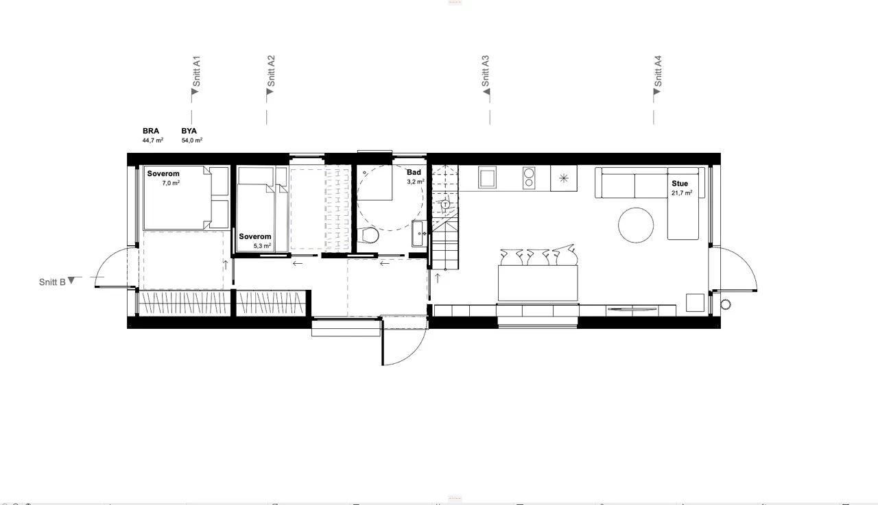 Stue/kjøkken: Stue og kjøkken ligger i åpen løsning og er et herlig allrom på 20,6 kvm. Rommet får takhøyde på opptil 3,32 meter og store vinduer mot to himmelretninger. Ett av vinduene er fra gulv til tak. I tillegg får rommet takvinduer og utgang til tiltenkte utefasiliteter, hvor vi som leverandør kan være behjelpelige med å skape et flott utemiljø.