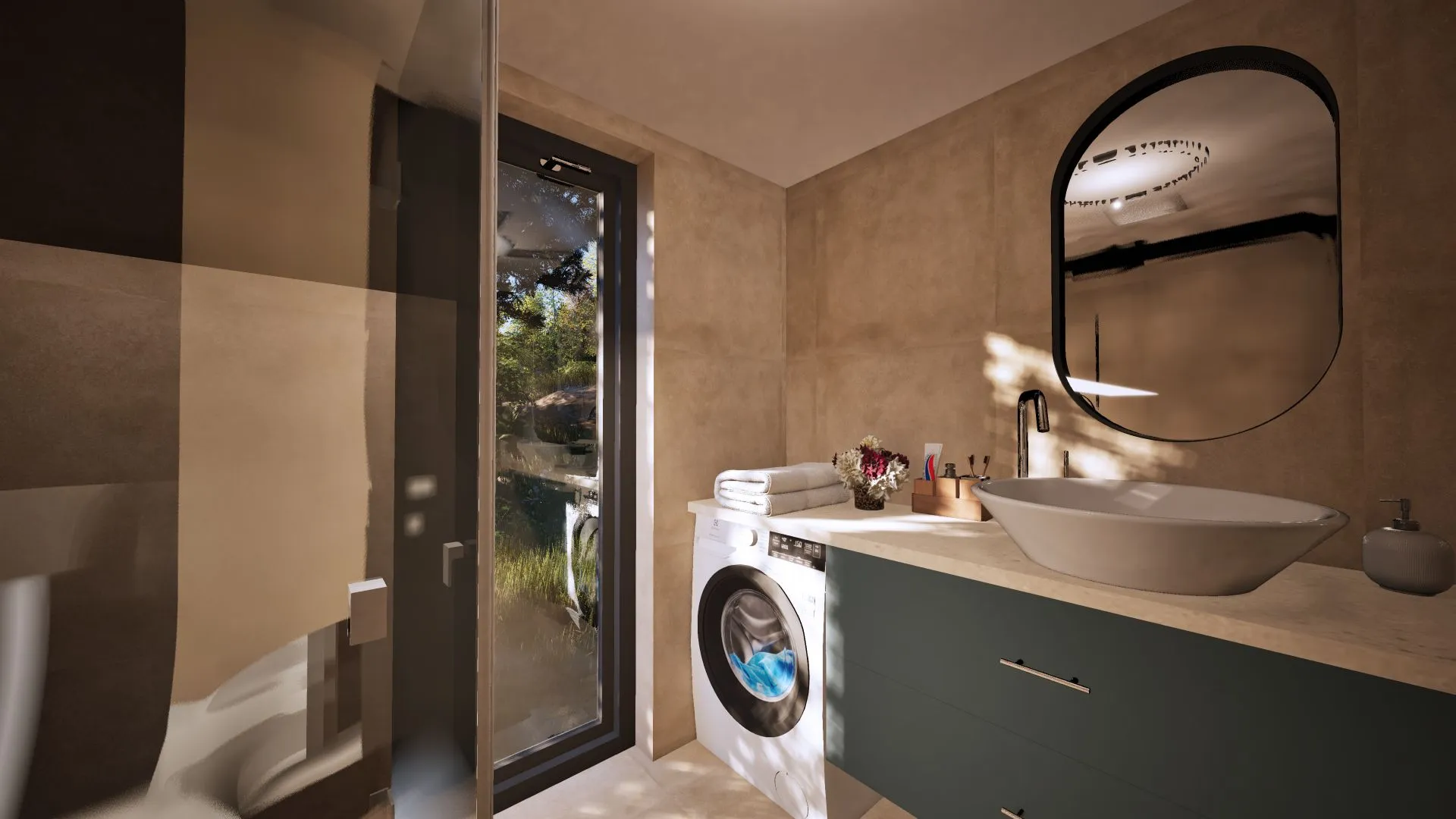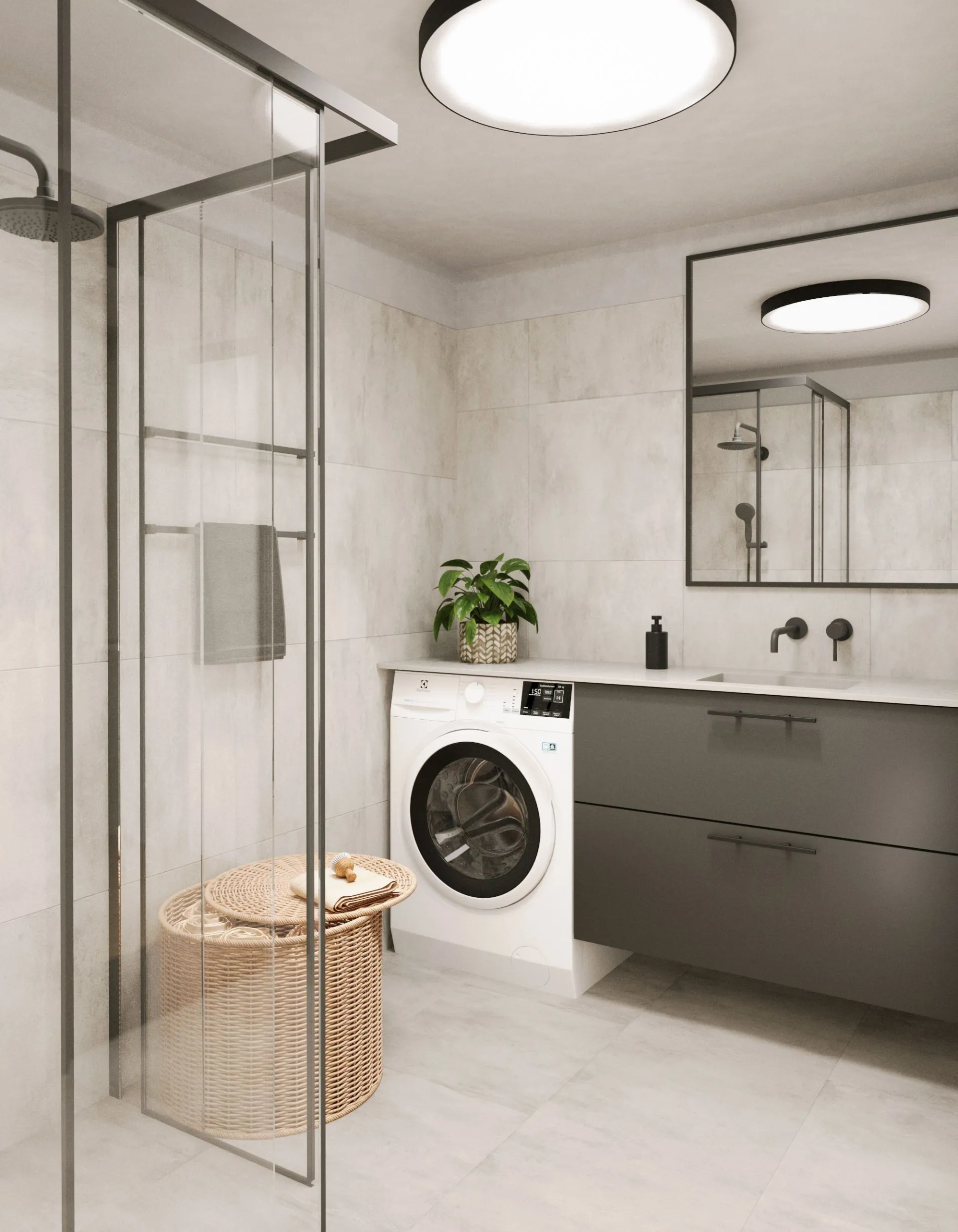 I tillegg medfølger speil med integrert lys, stikkontakt ved speilet, vegghengt toalett med softclose, dusjvegger i glass eller dusjkabinett, samt opplegg for vaskemaskin.