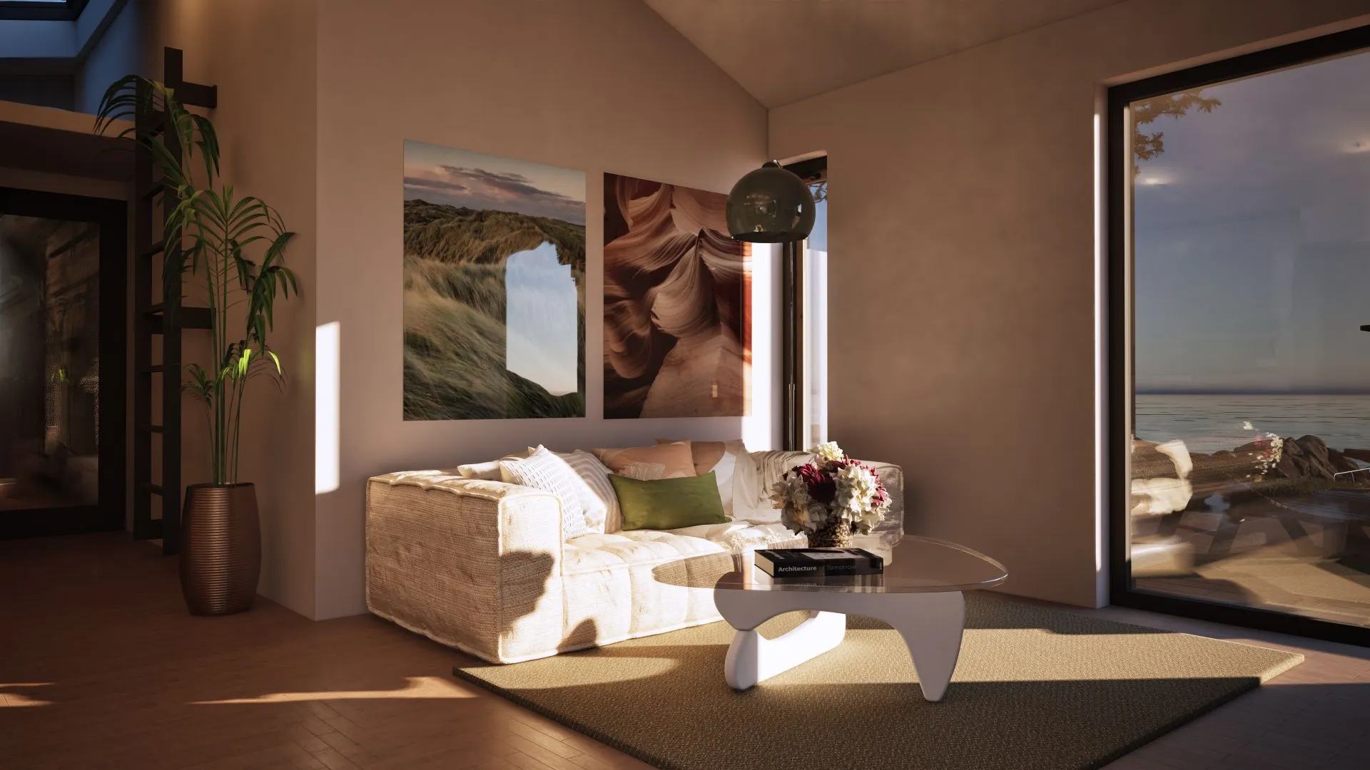 Listefri overgang mellom vegger og tak komplementerer husets moderne stil.