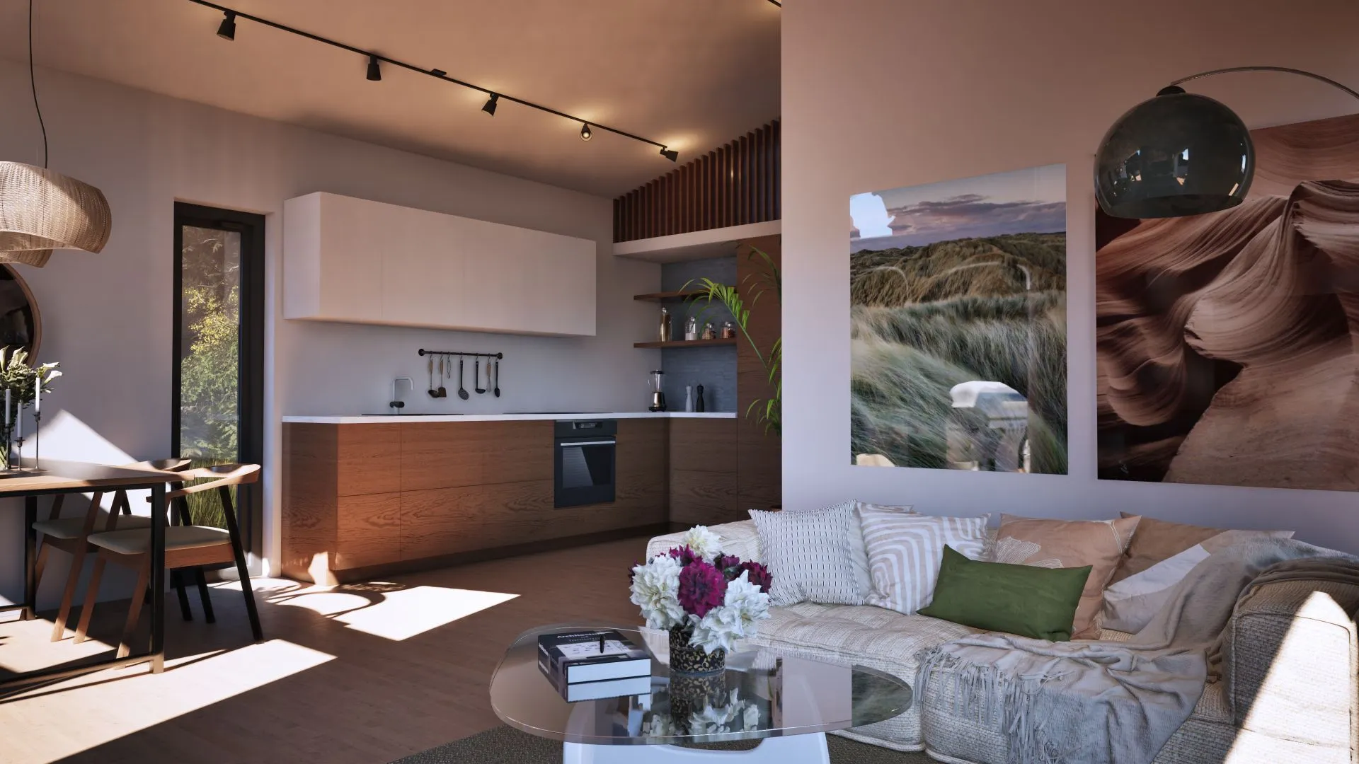 Stuen/kjøkkenet leveres med laminatgulv, gulvvarme, malte gipsvegger og malt gipstak med LED-lys. Fargen på maling er valgfritt, og gips kan endres til kryssfiner eller leire ved tilvalg. Gulvet kan for øvrig også endres til vinyl eller eikeparkett.