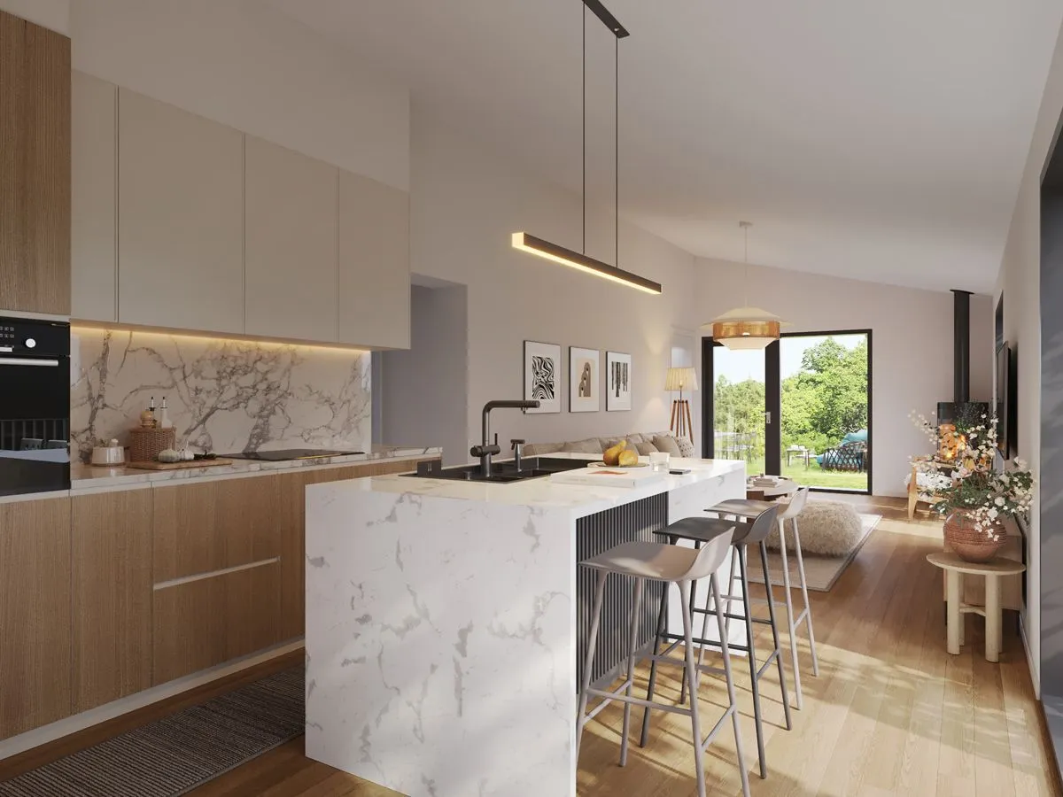 Stue og kjøkken ligger i åpen løsning og danner et lyst, luftig og sosialt allrom med takhøyde på inntil 3,35 meter. Store vindusflater gir rikelig med naturlig lys og god kontakt med naturen utenfor.
