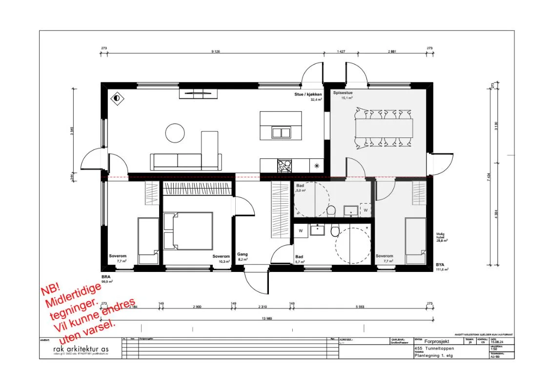 Det kan forekomme mindre justeringer i prosjektets tekniske løsninger. Leveransebeskrivelsen er retningsgivende ved avvik fra plantegninger.